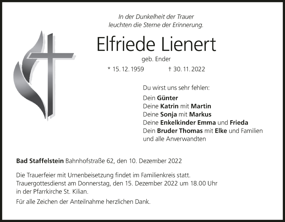 Hier finden Sie alle Traueranzeigen aus der Zeitung, die bisher für Elfriede Lienert erschienen sind. Weitere Traueranzeigen, die in der Zeitung erscheinen, werden hier ebenfalls aufgelistet