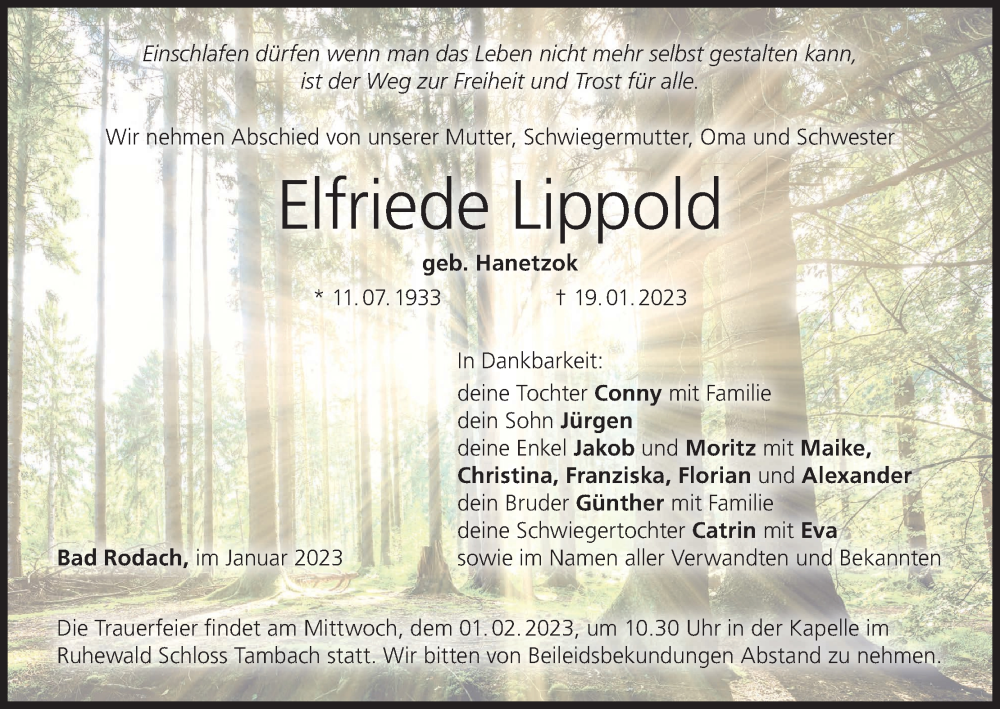 Hier finden Sie alle Traueranzeigen aus der Zeitung, die bisher für Elfriede Lippold erschienen sind. Weitere Traueranzeigen, die in der Zeitung erscheinen, werden hier ebenfalls aufgelistet