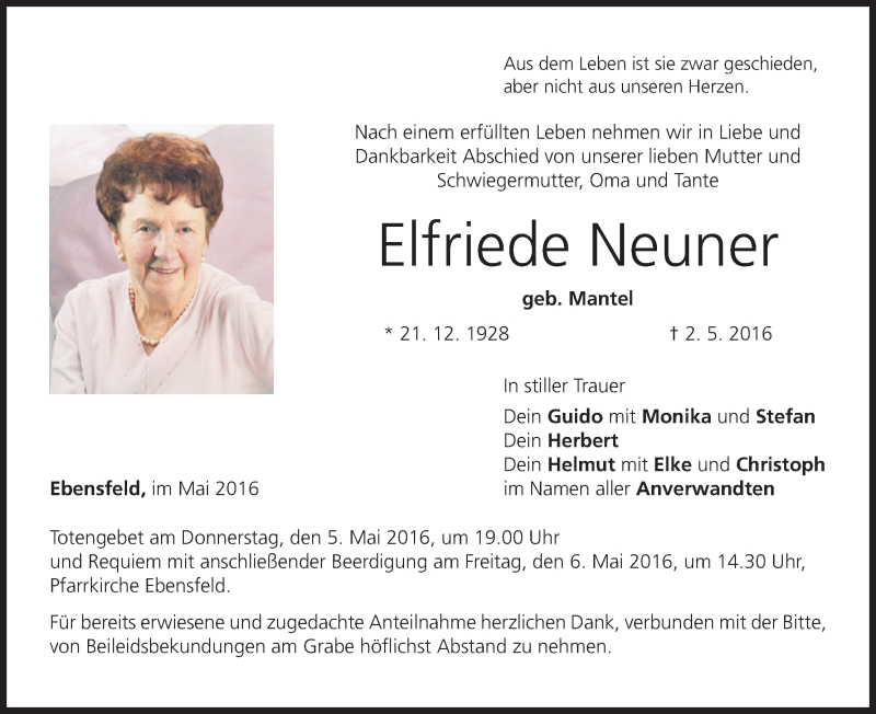 Hier finden Sie alle Traueranzeigen aus der Zeitung, die bisher für Elfriede Neuner erschienen sind. Weitere Traueranzeigen, die in der Zeitung erscheinen, werden hier ebenfalls aufgelistet
