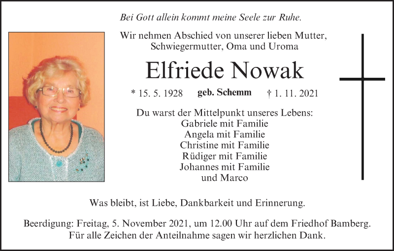 Hier finden Sie alle Traueranzeigen aus der Zeitung, die bisher für Elfriede Nowak erschienen sind. Weitere Traueranzeigen, die in der Zeitung erscheinen, werden hier ebenfalls aufgelistet