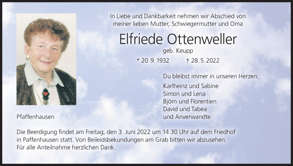 Hier finden Sie alle Traueranzeigen aus der Zeitung, die bisher für Elfriede Ottenweller erschienen sind. Weitere Traueranzeigen, die in der Zeitung erscheinen, werden hier ebenfalls aufgelistet