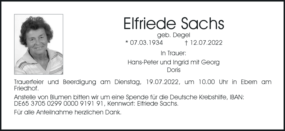 Hier finden Sie alle Traueranzeigen aus der Zeitung, die bisher für Elfriede Sachs erschienen sind. Weitere Traueranzeigen, die in der Zeitung erscheinen, werden hier ebenfalls aufgelistet