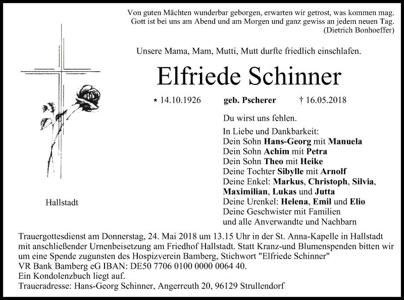 Hier finden Sie alle Traueranzeigen aus der Zeitung, die bisher für Elfriede Schinner erschienen sind. Weitere Traueranzeigen, die in der Zeitung erscheinen, werden hier ebenfalls aufgelistet