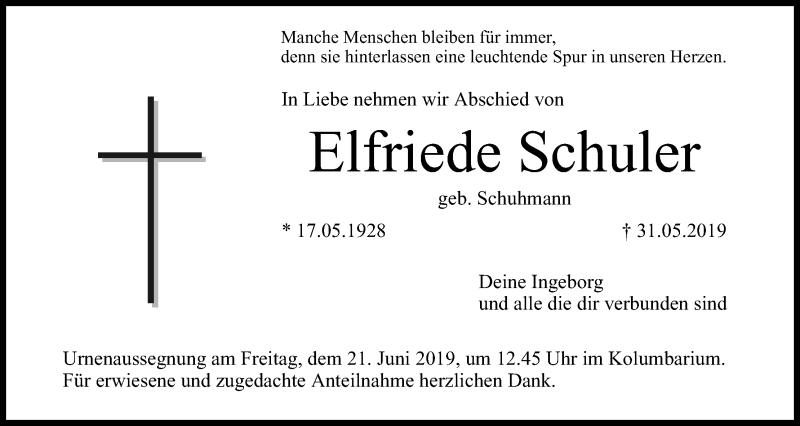 Hier finden Sie alle Traueranzeigen aus der Zeitung, die bisher für Elfriede Schuler erschienen sind. Weitere Traueranzeigen, die in der Zeitung erscheinen, werden hier ebenfalls aufgelistet