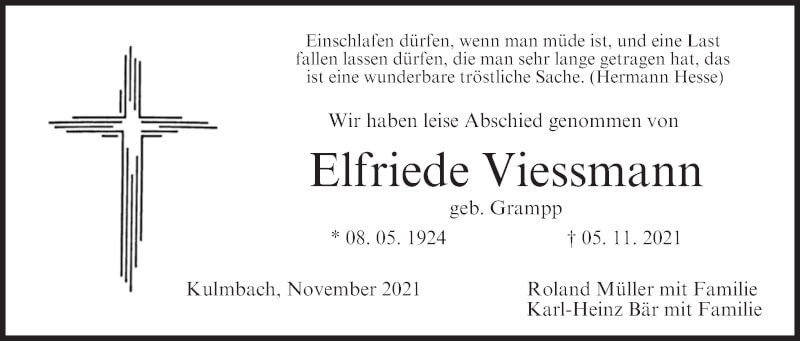 Hier finden Sie alle Traueranzeigen aus der Zeitung, die bisher für Elfriede Viessmann erschienen sind. Weitere Traueranzeigen, die in der Zeitung erscheinen, werden hier ebenfalls aufgelistet