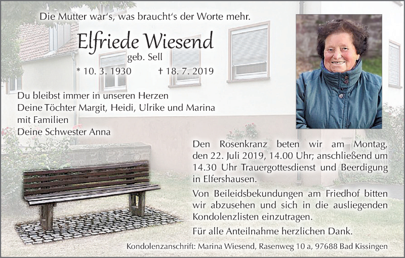 Hier finden Sie alle Traueranzeigen aus der Zeitung, die bisher für Elfriede Wiesend erschienen sind. Weitere Traueranzeigen, die in der Zeitung erscheinen, werden hier ebenfalls aufgelistet