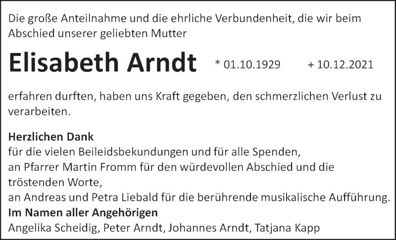 Hier finden Sie alle Traueranzeigen aus der Zeitung, die bisher für Elisabeth Arndt erschienen sind. Weitere Traueranzeigen, die in der Zeitung erscheinen, werden hier ebenfalls aufgelistet
