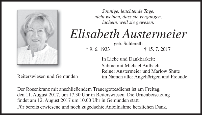 Hier finden Sie alle Traueranzeigen aus der Zeitung, die bisher für Elisabeth Austermeier erschienen sind. Weitere Traueranzeigen, die in der Zeitung erscheinen, werden hier ebenfalls aufgelistet