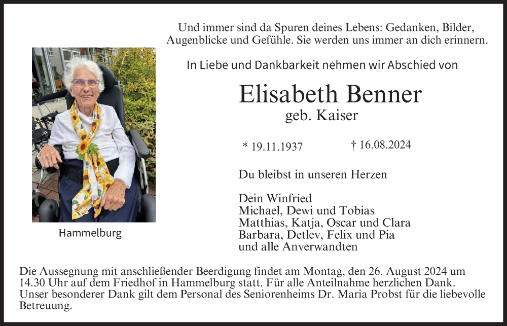 Hier finden Sie alle Traueranzeigen aus der Zeitung, die bisher für Elisabeth Benner erschienen sind. Weitere Traueranzeigen, die in der Zeitung erscheinen, werden hier ebenfalls aufgelistet