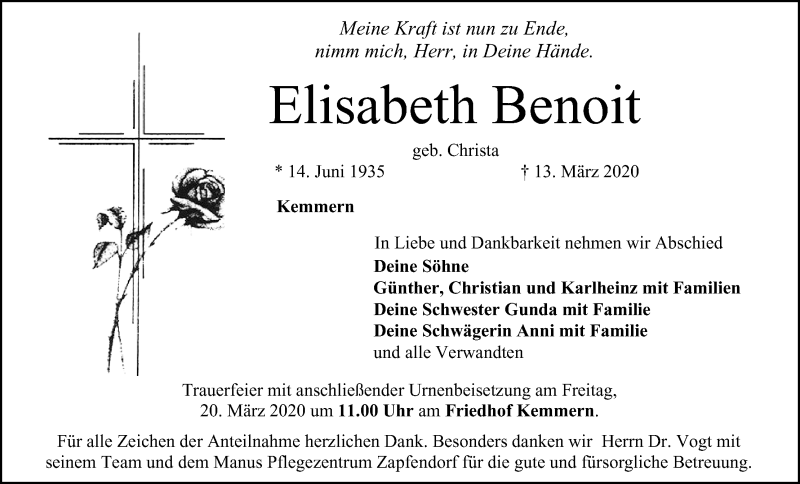 Hier finden Sie alle Traueranzeigen aus der Zeitung, die bisher für Elisabeth Benoit erschienen sind. Weitere Traueranzeigen, die in der Zeitung erscheinen, werden hier ebenfalls aufgelistet