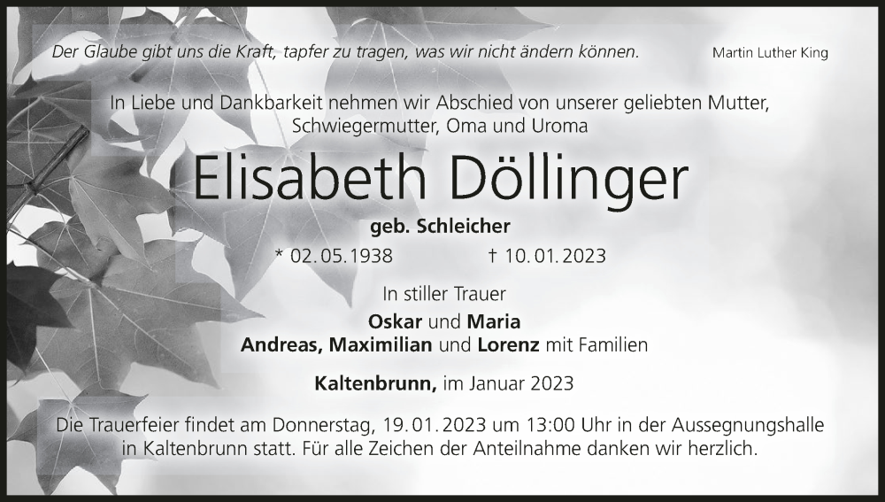 Hier finden Sie alle Traueranzeigen aus der Zeitung, die bisher für Elisabeth Döllinger erschienen sind. Weitere Traueranzeigen, die in der Zeitung erscheinen, werden hier ebenfalls aufgelistet