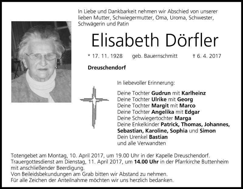 Hier finden Sie alle Traueranzeigen aus der Zeitung, die bisher für Elisabeth Dörfler erschienen sind. Weitere Traueranzeigen, die in der Zeitung erscheinen, werden hier ebenfalls aufgelistet
