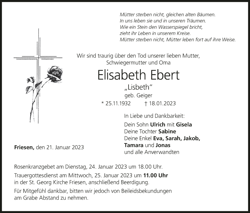 Hier finden Sie alle Traueranzeigen aus der Zeitung, die bisher für Elisabeth Ebert erschienen sind. Weitere Traueranzeigen, die in der Zeitung erscheinen, werden hier ebenfalls aufgelistet
