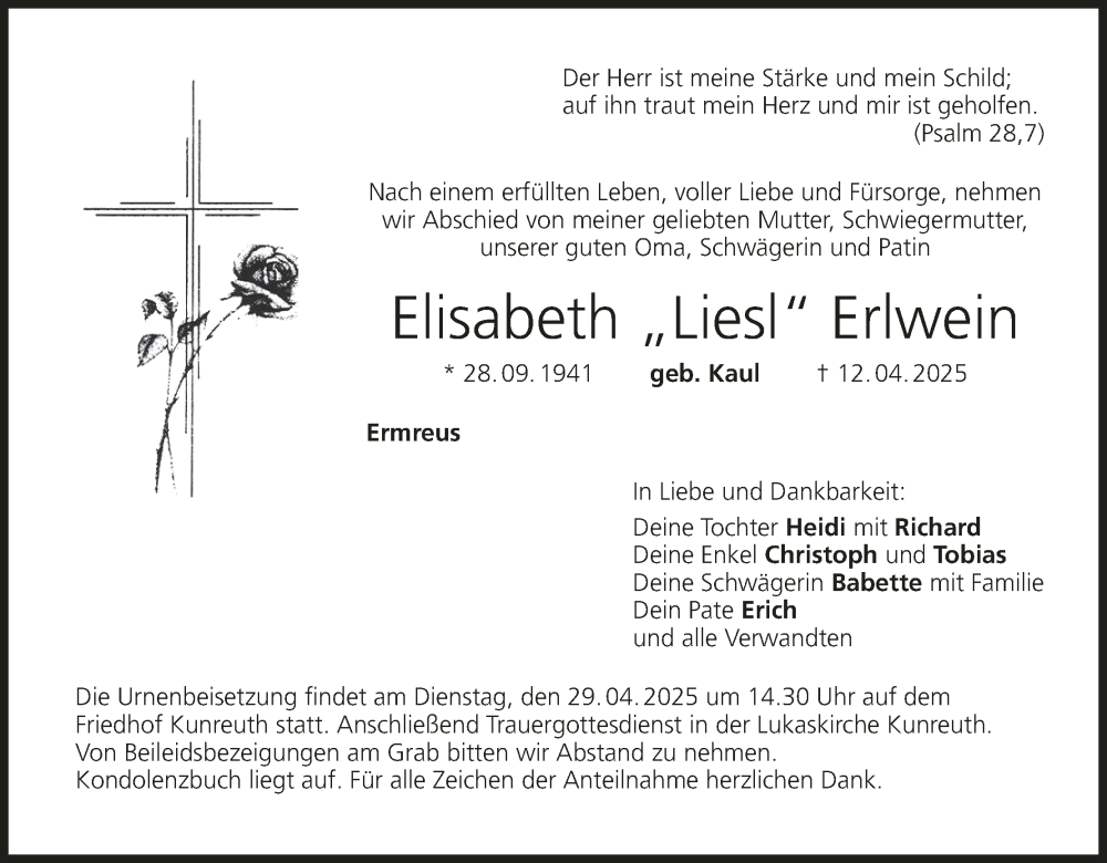 Hier finden Sie alle Traueranzeigen aus der Zeitung, die bisher für Elisabeth Erlwein erschienen sind. Weitere Traueranzeigen, die in der Zeitung erscheinen, werden hier ebenfalls aufgelistet