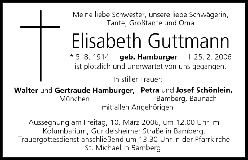 Hier finden Sie alle Traueranzeigen aus der Zeitung, die bisher für Elisabeth Guttmann erschienen sind. Weitere Traueranzeigen, die in der Zeitung erscheinen, werden hier ebenfalls aufgelistet