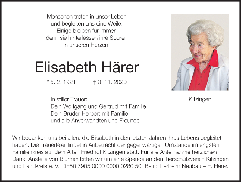 Hier finden Sie alle Traueranzeigen aus der Zeitung, die bisher für Elisabeth Härer erschienen sind. Weitere Traueranzeigen, die in der Zeitung erscheinen, werden hier ebenfalls aufgelistet