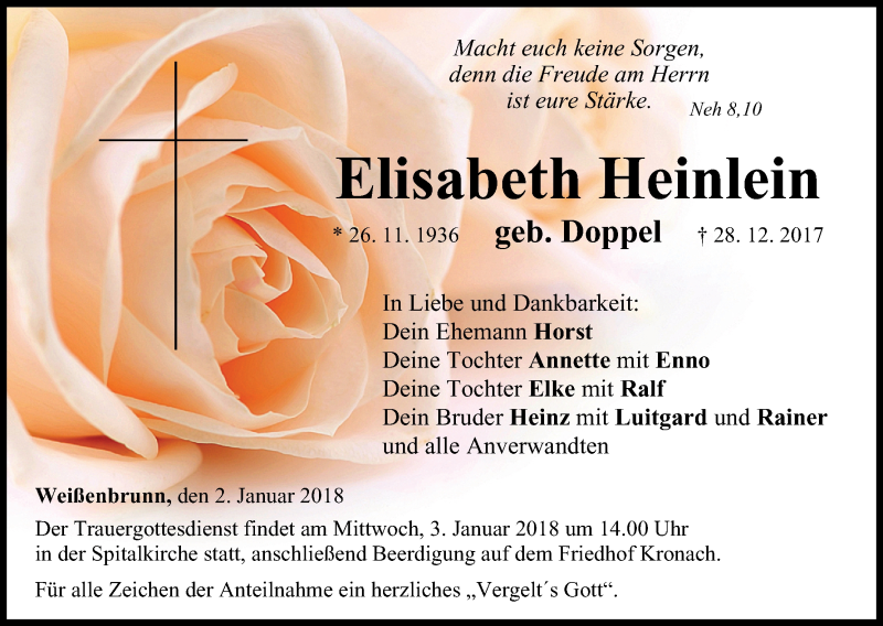 Hier finden Sie alle Traueranzeigen aus der Zeitung, die bisher für Elisabeth Heinlein erschienen sind. Weitere Traueranzeigen, die in der Zeitung erscheinen, werden hier ebenfalls aufgelistet