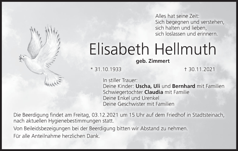 Hier finden Sie alle Traueranzeigen aus der Zeitung, die bisher für Elisabeth Hellmuth erschienen sind. Weitere Traueranzeigen, die in der Zeitung erscheinen, werden hier ebenfalls aufgelistet