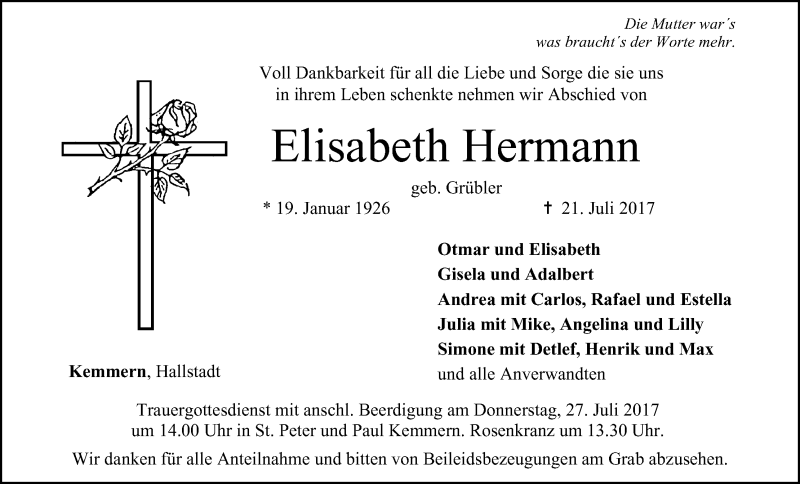 Hier finden Sie alle Traueranzeigen aus der Zeitung, die bisher für Elisabeth Hermann erschienen sind. Weitere Traueranzeigen, die in der Zeitung erscheinen, werden hier ebenfalls aufgelistet