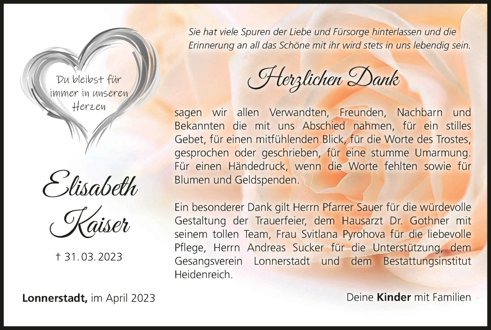 Hier finden Sie alle Traueranzeigen aus der Zeitung, die bisher für Elisabeth Kaiser erschienen sind. Weitere Traueranzeigen, die in der Zeitung erscheinen, werden hier ebenfalls aufgelistet