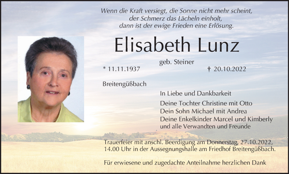 Hier finden Sie alle Traueranzeigen aus der Zeitung, die bisher für Elisabeth Lunz erschienen sind. Weitere Traueranzeigen, die in der Zeitung erscheinen, werden hier ebenfalls aufgelistet