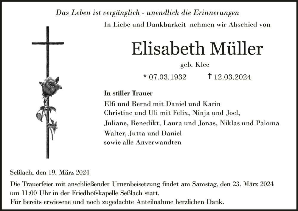 Hier finden Sie alle Traueranzeigen aus der Zeitung, die bisher für Elisabeth Müller erschienen sind. Weitere Traueranzeigen, die in der Zeitung erscheinen, werden hier ebenfalls aufgelistet
