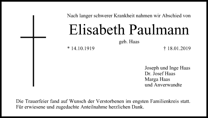 Hier finden Sie alle Traueranzeigen aus der Zeitung, die bisher für Elisabeth Paulmann erschienen sind. Weitere Traueranzeigen, die in der Zeitung erscheinen, werden hier ebenfalls aufgelistet