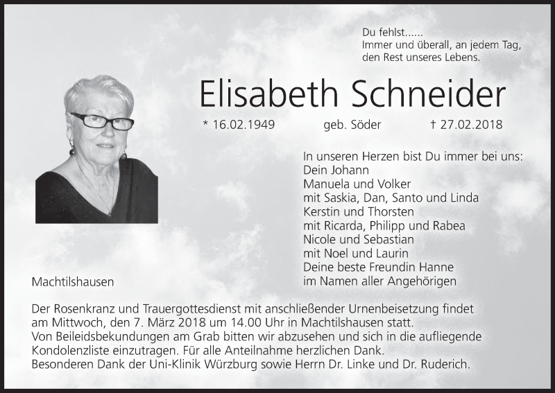 Hier finden Sie alle Traueranzeigen aus der Zeitung, die bisher für Elisabeth Schneider erschienen sind. Weitere Traueranzeigen, die in der Zeitung erscheinen, werden hier ebenfalls aufgelistet