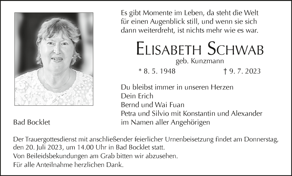 Hier finden Sie alle Traueranzeigen aus der Zeitung, die bisher für Elisabeth Schwab erschienen sind. Weitere Traueranzeigen, die in der Zeitung erscheinen, werden hier ebenfalls aufgelistet