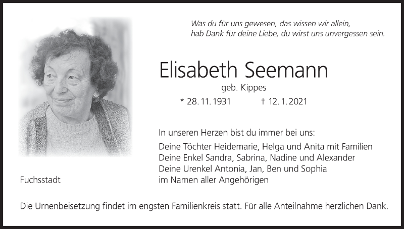 Hier finden Sie alle Traueranzeigen aus der Zeitung, die bisher für Elisabeth Seemann erschienen sind. Weitere Traueranzeigen, die in der Zeitung erscheinen, werden hier ebenfalls aufgelistet