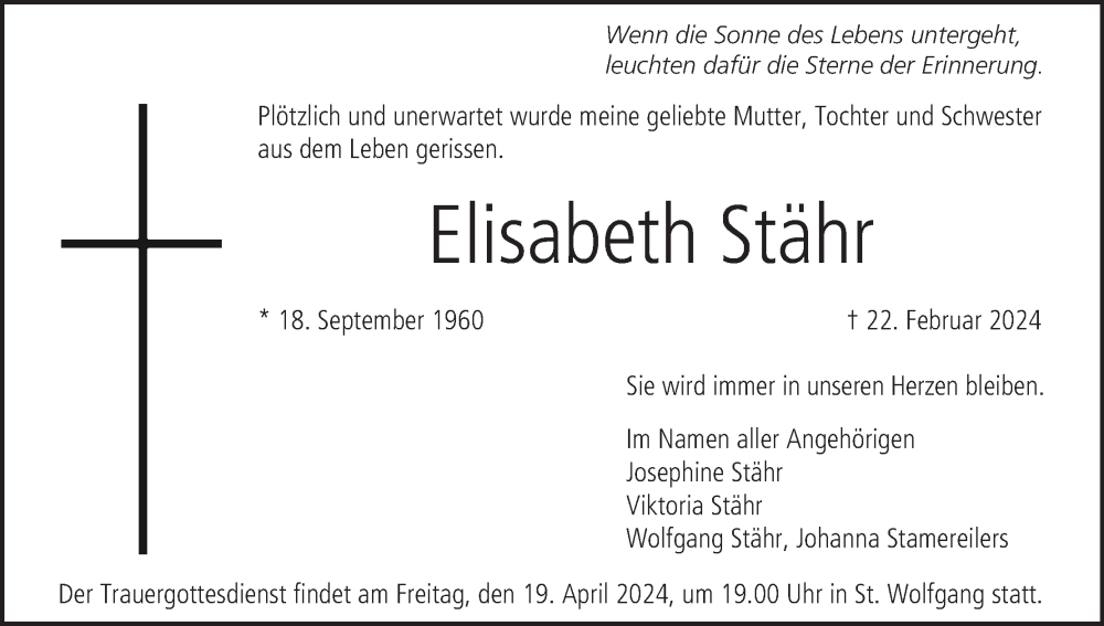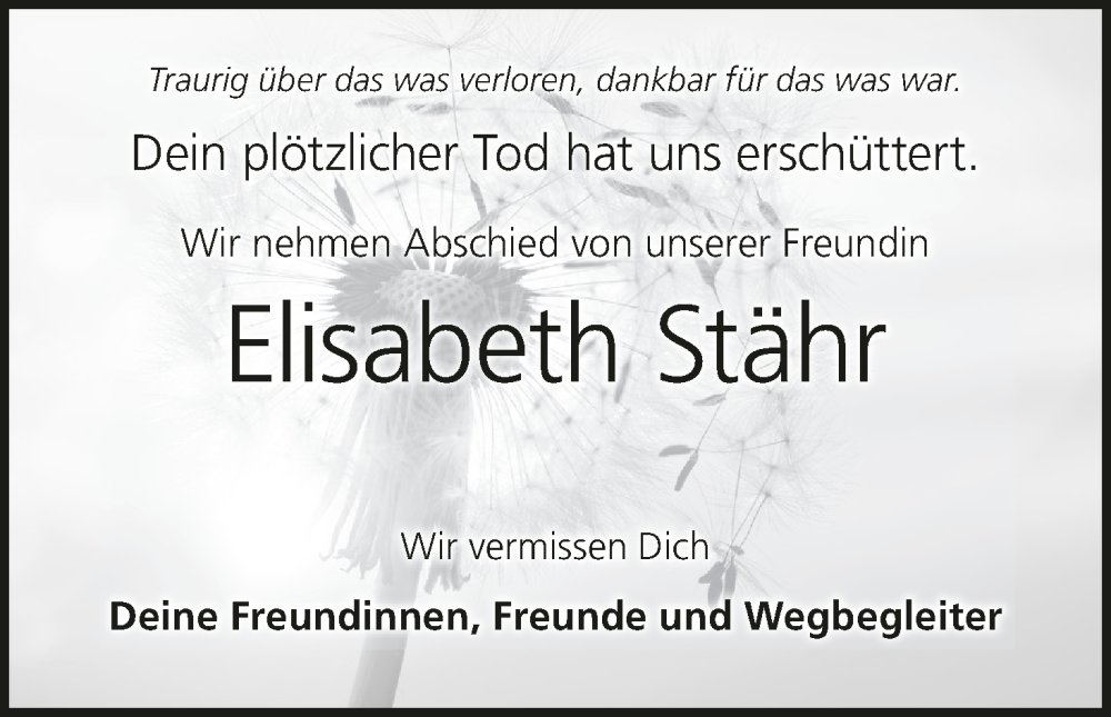 Hier finden Sie alle Traueranzeigen aus der Zeitung, die bisher für Elisabeth Stähr erschienen sind. Weitere Traueranzeigen, die in der Zeitung erscheinen, werden hier ebenfalls aufgelistet