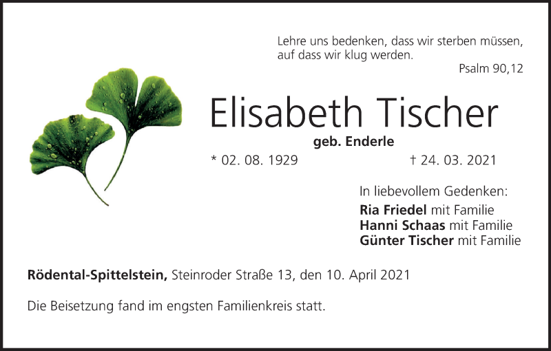 Hier finden Sie alle Traueranzeigen aus der Zeitung, die bisher für Elisabeth Tischer erschienen sind. Weitere Traueranzeigen, die in der Zeitung erscheinen, werden hier ebenfalls aufgelistet