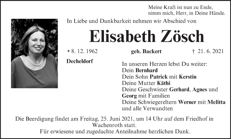 Hier finden Sie alle Traueranzeigen aus der Zeitung, die bisher für Elisabeth Zösch erschienen sind. Weitere Traueranzeigen, die in der Zeitung erscheinen, werden hier ebenfalls aufgelistet