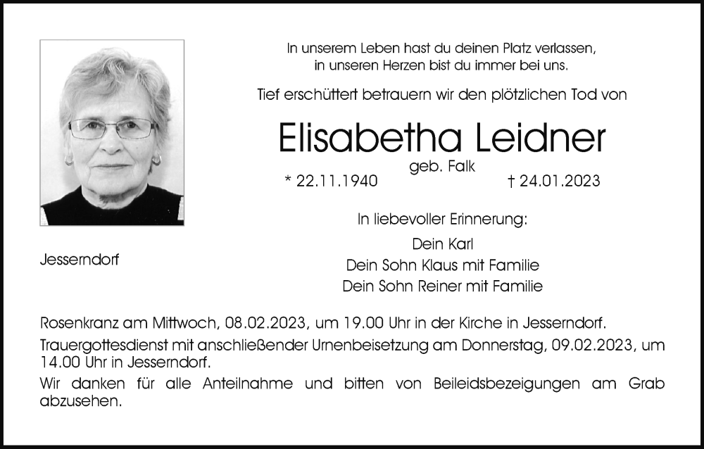 Hier finden Sie alle Traueranzeigen aus der Zeitung, die bisher für Elisabetha Leidner erschienen sind. Weitere Traueranzeigen, die in der Zeitung erscheinen, werden hier ebenfalls aufgelistet