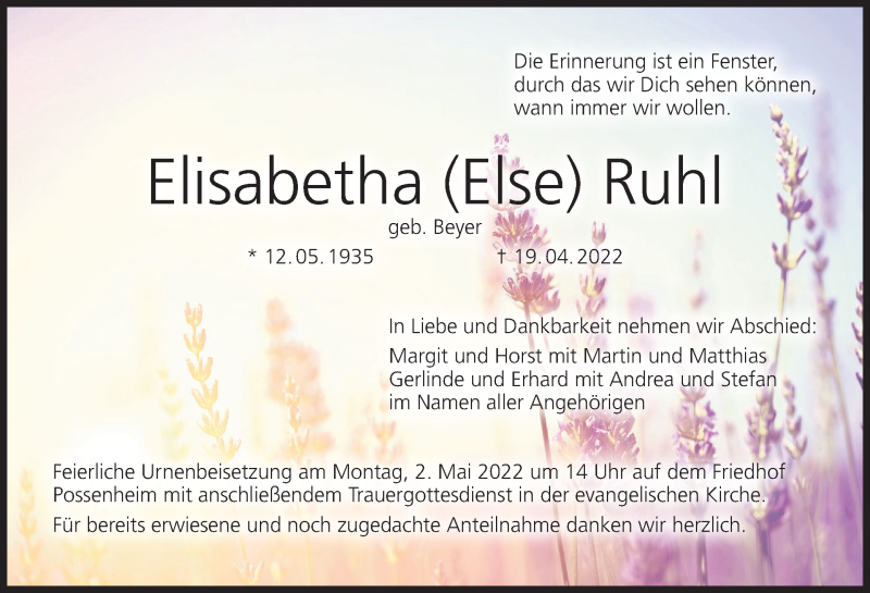 Hier finden Sie alle Traueranzeigen aus der Zeitung, die bisher für Elisabetha Ruhl erschienen sind. Weitere Traueranzeigen, die in der Zeitung erscheinen, werden hier ebenfalls aufgelistet