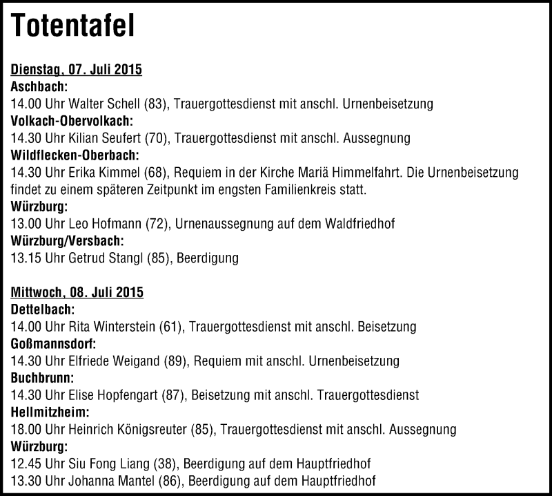 Hier finden Sie alle Traueranzeigen aus der Zeitung, die bisher für Elise Hopfengart erschienen sind. Weitere Traueranzeigen, die in der Zeitung erscheinen, werden hier ebenfalls aufgelistet