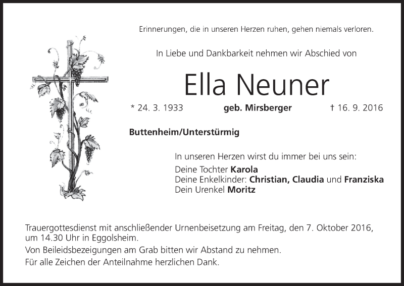 Hier finden Sie alle Traueranzeigen aus der Zeitung, die bisher für Ella Neuner erschienen sind. Weitere Traueranzeigen, die in der Zeitung erscheinen, werden hier ebenfalls aufgelistet
