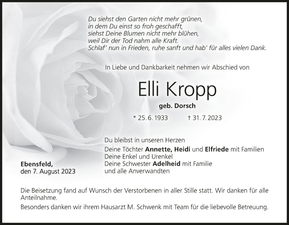 Hier finden Sie alle Traueranzeigen aus der Zeitung, die bisher für Elli Kropp erschienen sind. Weitere Traueranzeigen, die in der Zeitung erscheinen, werden hier ebenfalls aufgelistet