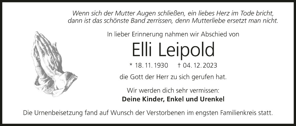 Hier finden Sie alle Traueranzeigen aus der Zeitung, die bisher für Elli Leipold erschienen sind. Weitere Traueranzeigen, die in der Zeitung erscheinen, werden hier ebenfalls aufgelistet