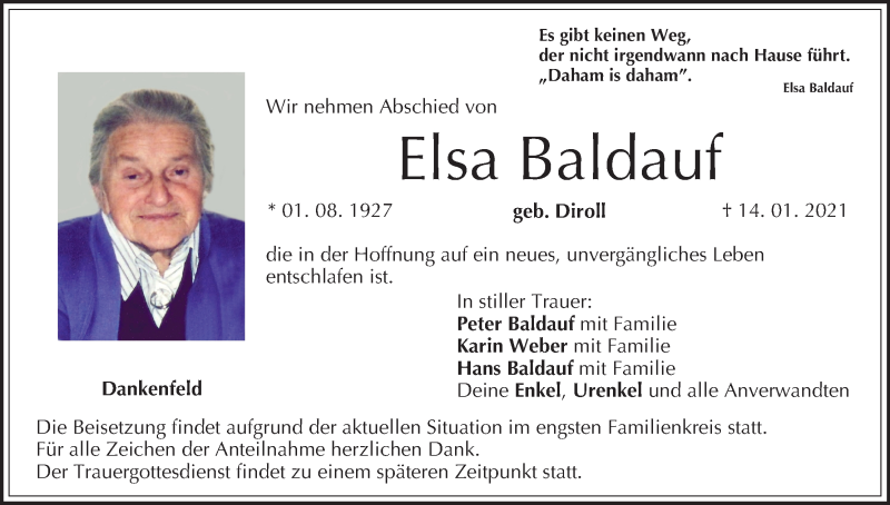 Hier finden Sie alle Traueranzeigen aus der Zeitung, die bisher für Elsa Baldauf erschienen sind. Weitere Traueranzeigen, die in der Zeitung erscheinen, werden hier ebenfalls aufgelistet
