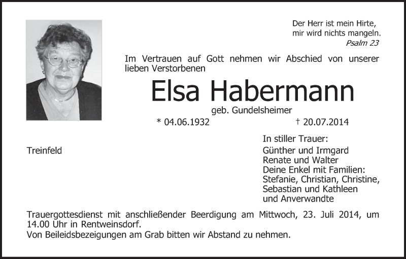 Hier finden Sie alle Traueranzeigen aus der Zeitung, die bisher für Elsa Habermann erschienen sind. Weitere Traueranzeigen, die in der Zeitung erscheinen, werden hier ebenfalls aufgelistet
