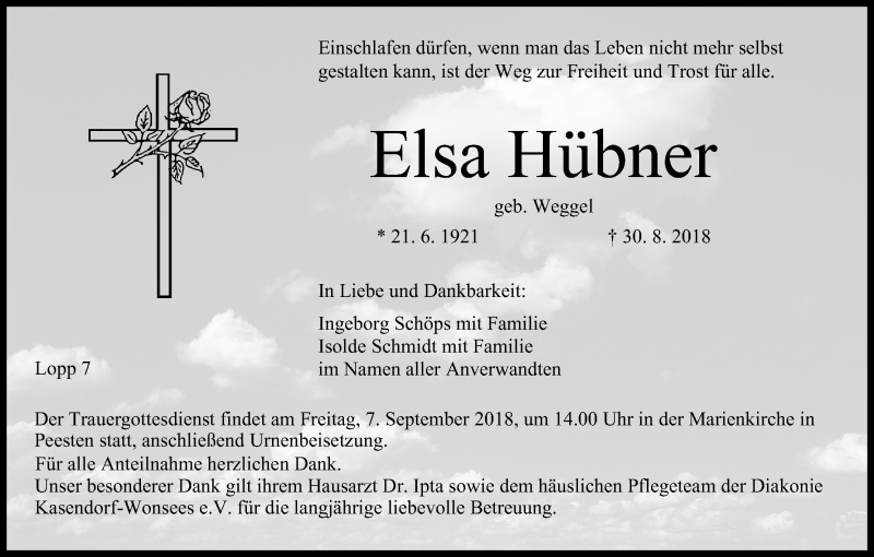 Hier finden Sie alle Traueranzeigen aus der Zeitung, die bisher für Elsa Hübner erschienen sind. Weitere Traueranzeigen, die in der Zeitung erscheinen, werden hier ebenfalls aufgelistet