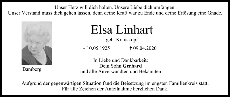 Hier finden Sie alle Traueranzeigen aus der Zeitung, die bisher für Elsa Linhart erschienen sind. Weitere Traueranzeigen, die in der Zeitung erscheinen, werden hier ebenfalls aufgelistet