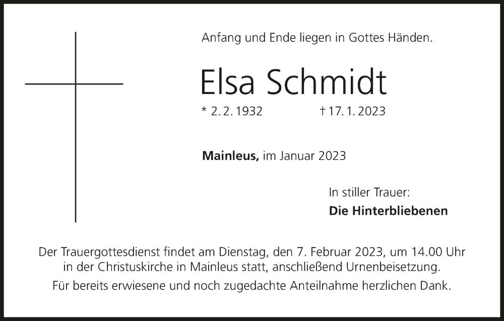 Hier finden Sie alle Traueranzeigen aus der Zeitung, die bisher für Elsa Schmidt erschienen sind. Weitere Traueranzeigen, die in der Zeitung erscheinen, werden hier ebenfalls aufgelistet