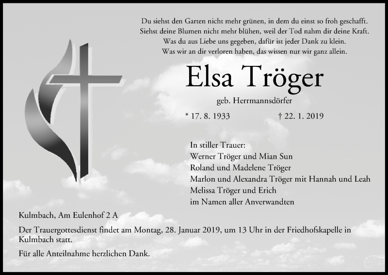 Hier finden Sie alle Traueranzeigen aus der Zeitung, die bisher für Elsa Tröger erschienen sind. Weitere Traueranzeigen, die in der Zeitung erscheinen, werden hier ebenfalls aufgelistet