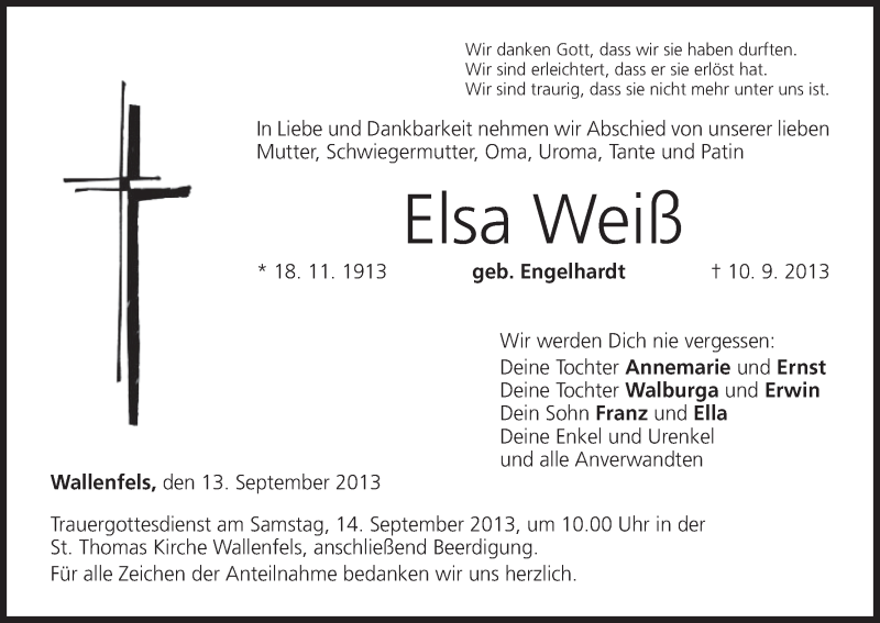 Hier finden Sie alle Traueranzeigen aus der Zeitung, die bisher für Elsa Weiß erschienen sind. Weitere Traueranzeigen, die in der Zeitung erscheinen, werden hier ebenfalls aufgelistet