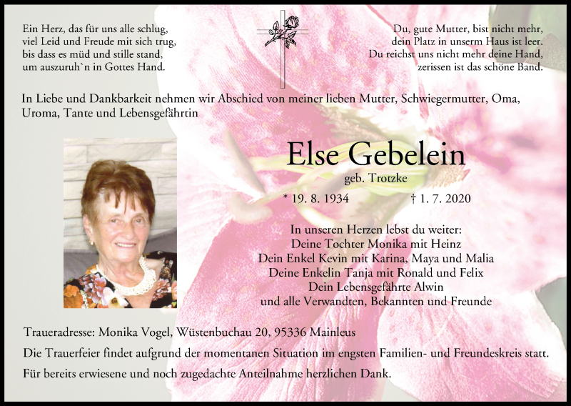 Hier finden Sie alle Traueranzeigen aus der Zeitung, die bisher für Else Gebelein erschienen sind. Weitere Traueranzeigen, die in der Zeitung erscheinen, werden hier ebenfalls aufgelistet
