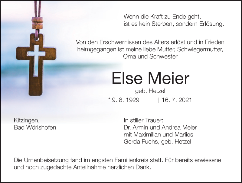 Hier finden Sie alle Traueranzeigen aus der Zeitung, die bisher für Else Meier erschienen sind. Weitere Traueranzeigen, die in der Zeitung erscheinen, werden hier ebenfalls aufgelistet