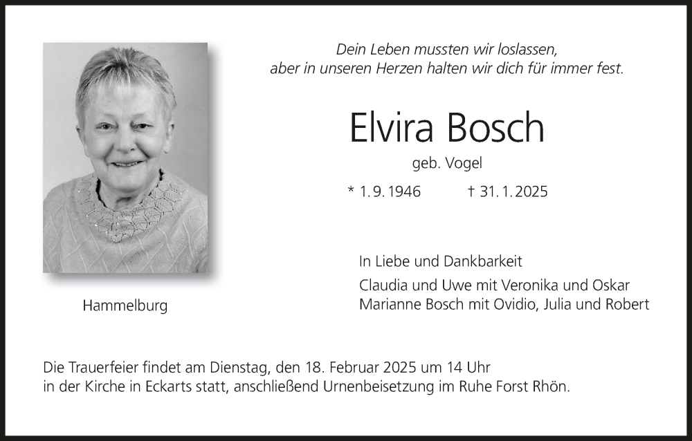 Hier finden Sie alle Traueranzeigen aus der Zeitung, die bisher für Elvira Bosch erschienen sind. Weitere Traueranzeigen, die in der Zeitung erscheinen, werden hier ebenfalls aufgelistet