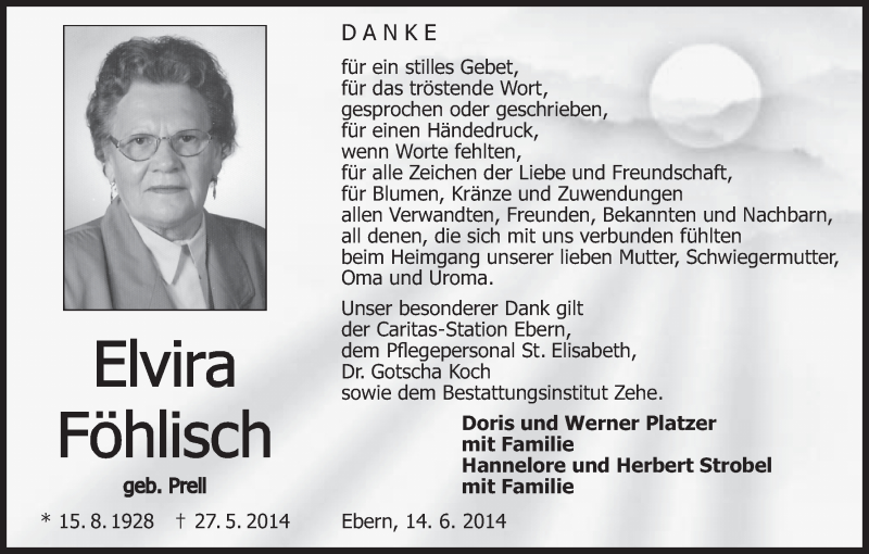 Hier finden Sie alle Traueranzeigen aus der Zeitung, die bisher für Elvira Föhlisch erschienen sind. Weitere Traueranzeigen, die in der Zeitung erscheinen, werden hier ebenfalls aufgelistet